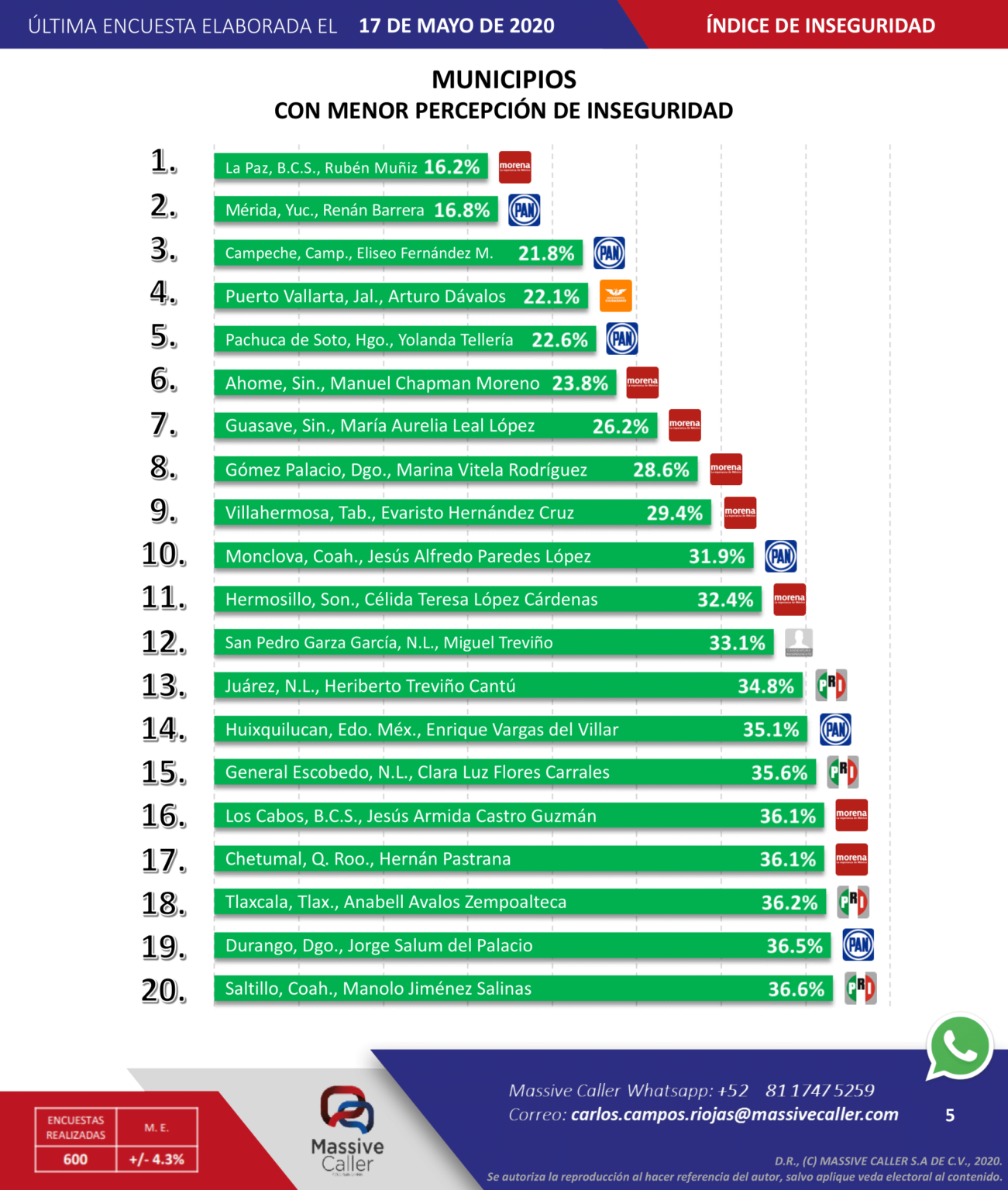 Los Mochis, Sinaloa. – La empresa Massive Caller, especializada en la realización de consultas de opinión publica a través de encuestas telefónicas, publicó esta mañana el ranking de los municipios con menor índice de inseguridad y en el cual Ahome, ocupa el sexto lugar.