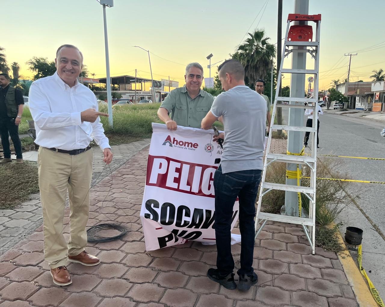 Los Mochis, Sinaloa, 14 de octubre 2025.- En punto de las cinco de la tarde, el alcalde Antonio Menendez De Llano Bermúdez, se dio cita por segundo día consecutivo en el nuevo socavón que se descubrió en Boulevard Centenario y calle Niños Héroes, acompañado de los Regidores, titulares de Obras Públicas, Japama, COMUN, Tesoreria, Tránsito Municipal y Seguridad Pública.