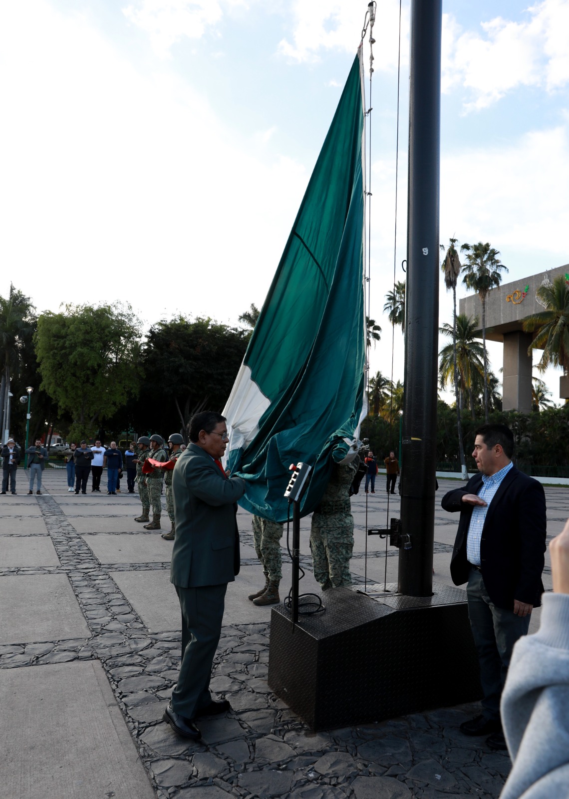 Culiacán, Sinaloa, 06 de enero del 2024.- Autoridades civiles y militares conmemoraron el 109 aniversario de la Promulgación de la Ley Agraria con un izamiento de bandera a toda asta y con Honores de Ordenanza en la plaza cívica de Palacio de Gobierno.