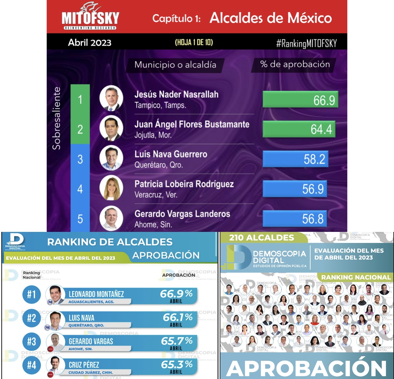Por otra parte, en la medida del desempeño de los alcaldes por su aprobación realizada por Demoscopia Digital Estudios de Opinión Pública durante el mismo mes de abril, el Presidente Municipal de Ahome Gerardo Octavio Vargas Landeros sube en el ranking y se posiciona en el número 3 con el 65.7% de aprobación.