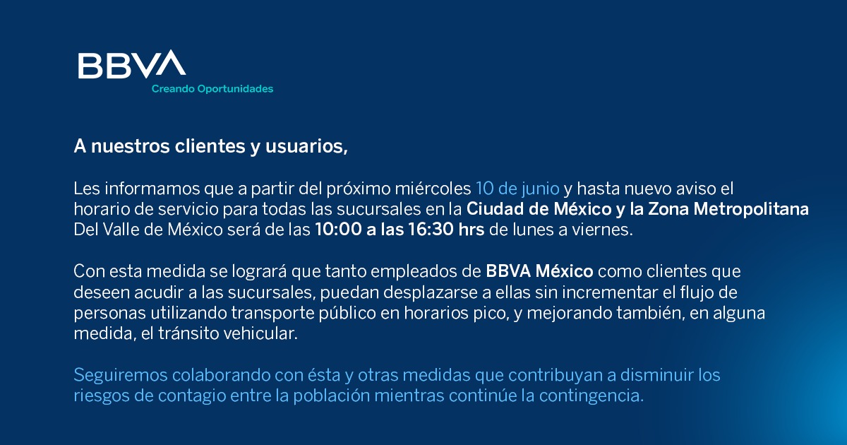 A partir del próximo miércoles 10 de junio las sucursales de BBVA México que están en operación en la Ciudad de México y la zona metropolitana del Valle de México cambiarán su horario y abrirán de las 10:00 a las 16:30 horas de lunes a viernes a finde evitar aglomeraciones en medio de la pandemia de coronavirus, informó el banco.