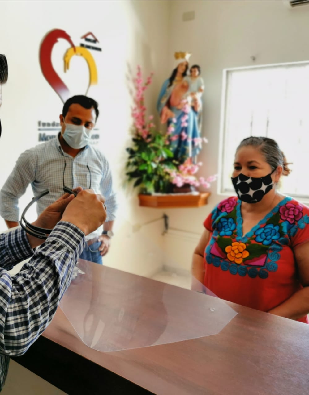 El apoyo que consistió en 200 caretas, 500 guantes, 400 cubrebocas y 20 litros de gel antibacterial, fue recibido por la Sra. Beatriz Delia Fierro, en representación de la Madre Superiora Elvia Eulalia Chusho Chávez, responsable de este Hogar