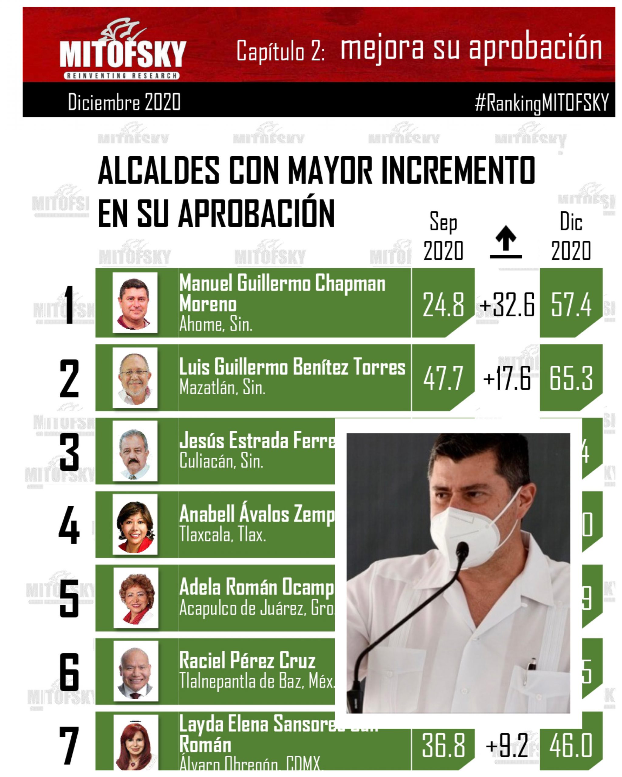 La casa encuestadora señala que de septiembre a diciembre del 2020 Manuel Guillermo Chapman Moreno creció en un 32 por ciento su aprobación ciudadana y lo coloca en el primer lugar de los alcaldes de México con el mayor incremento en su aprobación