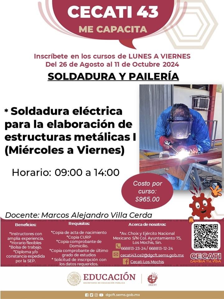 Los Mochis, Sinaloa.-El Centro de Capacitación para el Trabajo Industrial (Cecati) 43 abrirá sus puertas para nuevos cursos a partir del próximo 26 de agosto, ofreciendo una excelente oportunidad para quienes buscan adquirir habilidades laborales en poco tiempo.