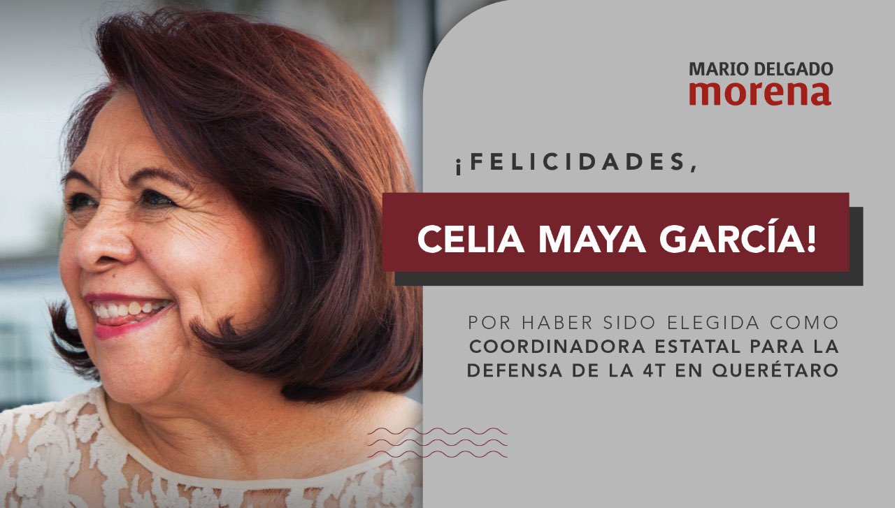 En conferencia de prensa, el presidente nacional de Morena, Mario Delgado Carrillo, anunció que, tras un ejercicio transparente y apegado a los estatutos del partido, la ex magistrada Celia Maya resultó ganadora de la encuesta en el estado de Querétaro, por lo que desde ahora es la coordinadora estatal para la defensa de la Cuarta Transformación.