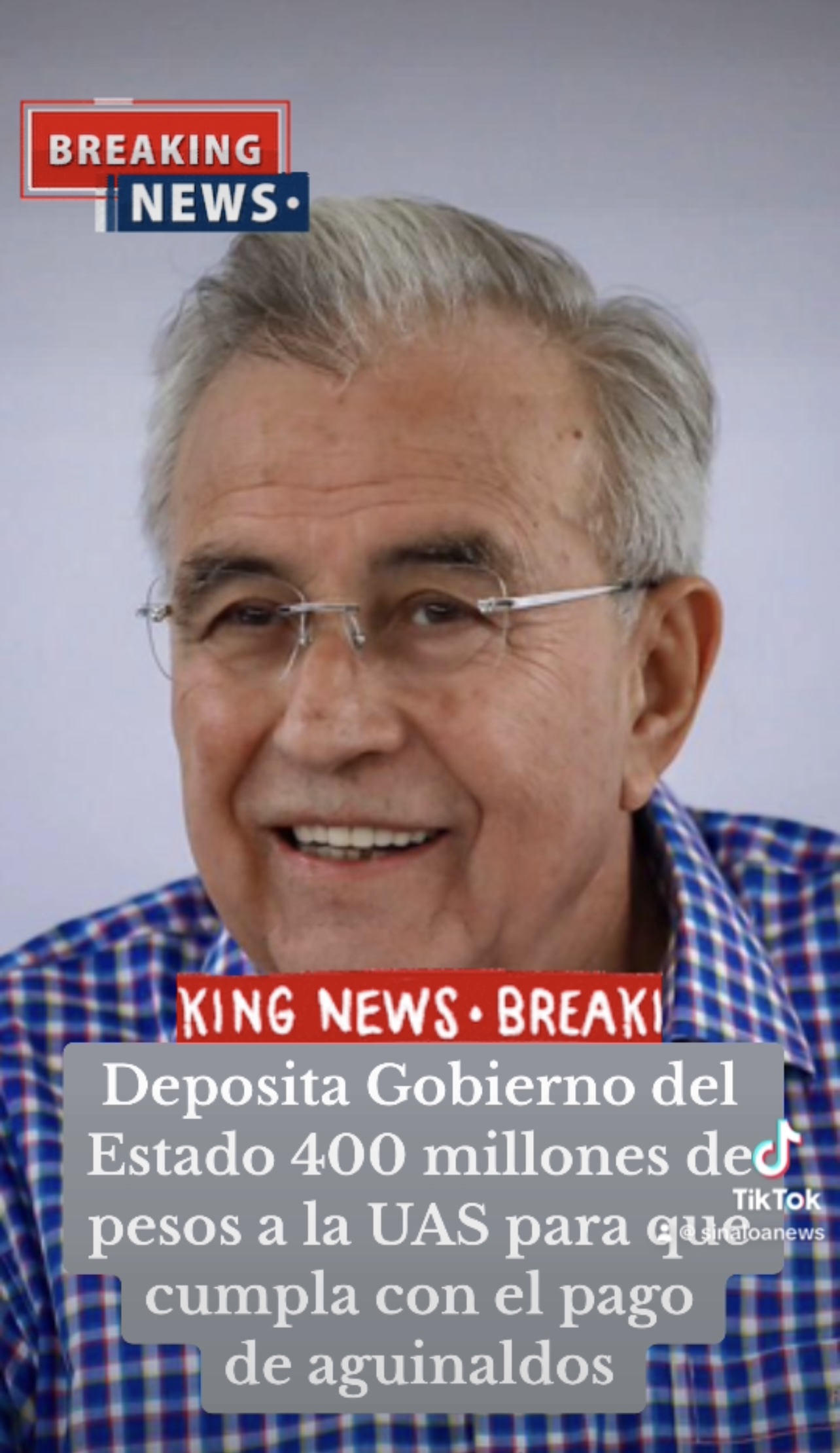 Culiacán, Sinaloa, a 20 de Diciembre de 2023.- En cumplimiento al compromiso realizado con la comunidad de la Universidad Autónoma de Sinaloa en el sentido de respaldarlos en cuanto al pago de su aguinaldo, el Gobernador Rubén Rocha Moya confirmó que este miércoles Gobierno del Estado depósito 400 millones de pesos a la principal institución educativa de Sinaloa, a efecto de que la UAS esté en condiciones de cumplir en tiempo y forma con este derecho de los trabajadores.