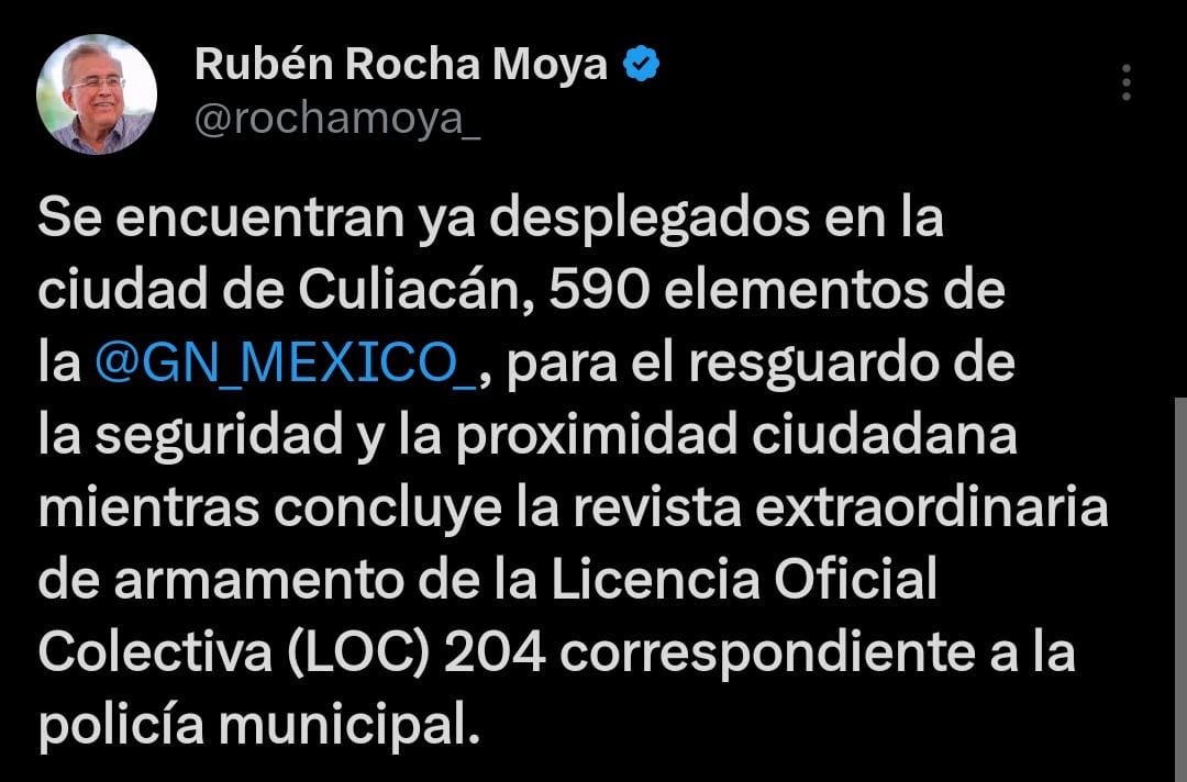 El gobernador de Sinaloa, Rubén Rocha Moya, anunció a través de sus redes sociales el despliegue de 590 elementos de la Guardia Nacional en la ciudad de Culiacán, como parte de un operativo estratégico para fortalecer la seguridad y mantener la proximidad con la ciudadanía.