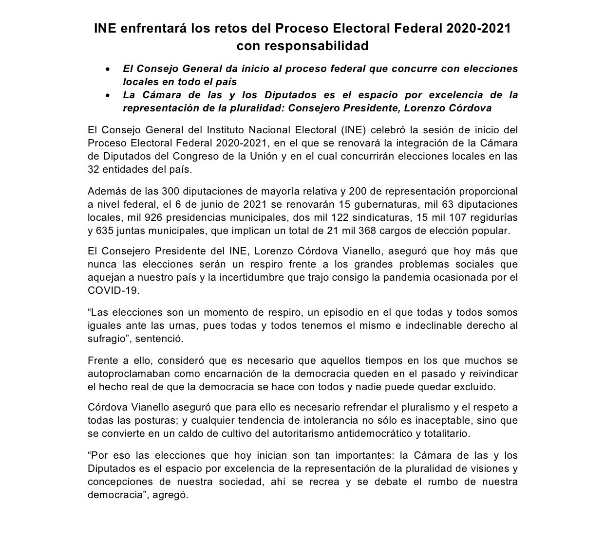 El Consejo General del Instituto Nacional Electoral (INE) celebró la sesión de inicio del Proceso Electoral Federal 2020-2021, en el que se renovará la integración de la Cámara de Diputados del Congreso de la Unión y en el cual concurrirán elecciones locales en las 32 entidades del país.