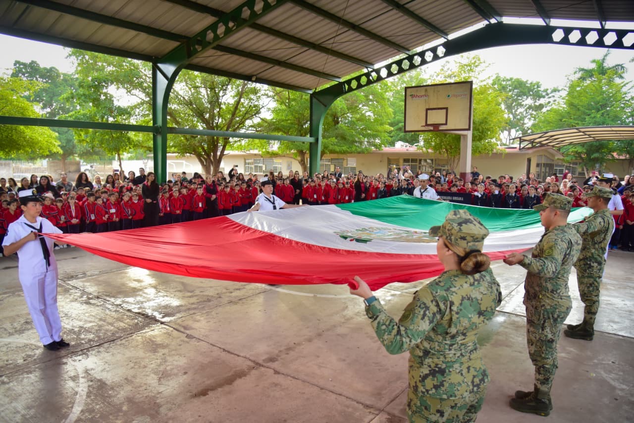 Durante la ceremonia, alumnas y alumnos formaron con sus manos el símbolo de “Ahome, la Casa de Todos”, gesto que generó una reacción emotiva del Presidente Municipal, Antonio Menéndez de Llano Bermúdez, quien agradeció la sorpresa y reconoció el valor de la educación como base del futuro del municipio.