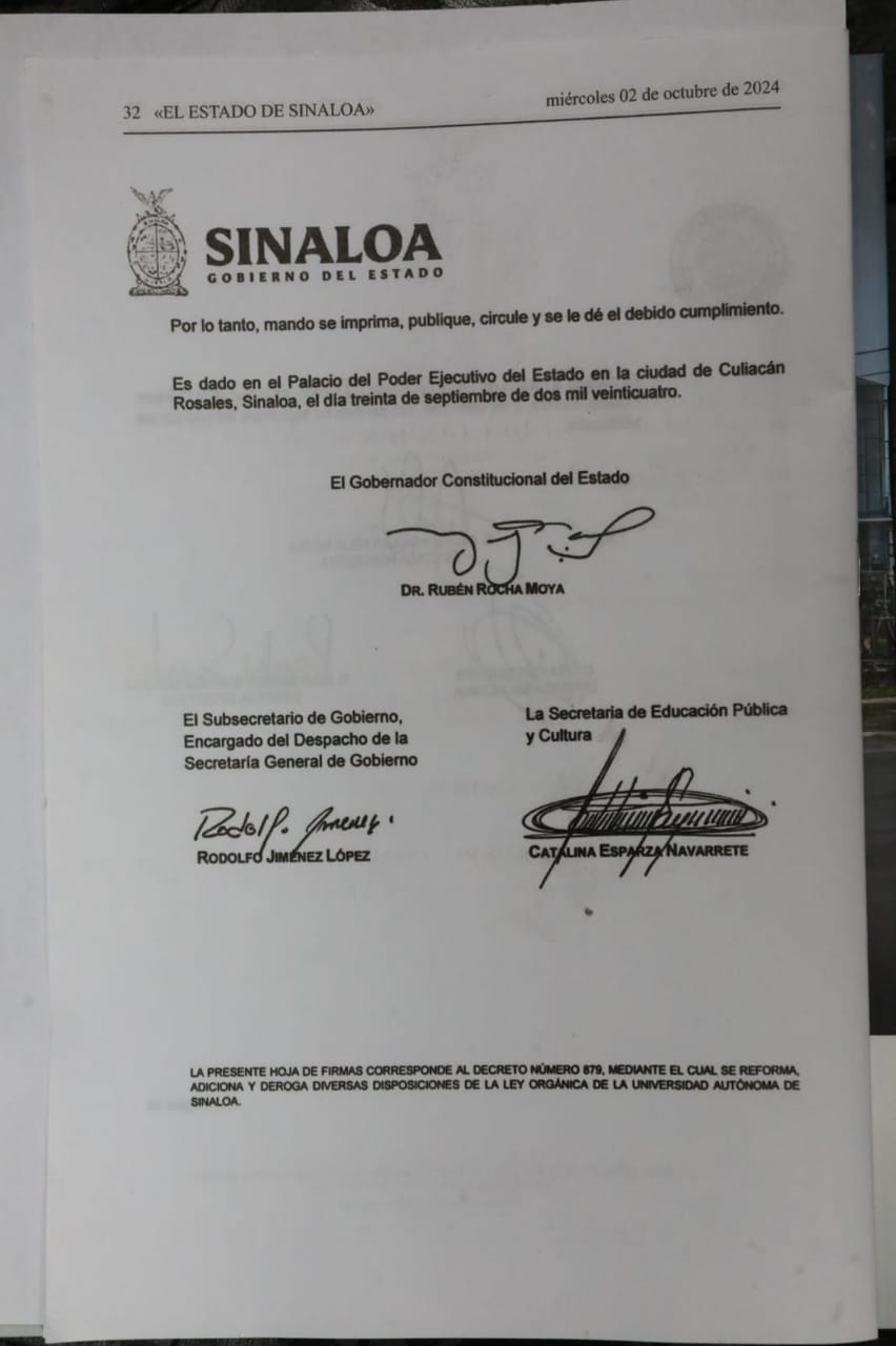 Este miércoles 2 de octubre, las reformas a la Ley Orgánica de la Universidad Autónoma de Sinaloa (UAS) fueron oficialmente publicadas en la edición vespertina del Periódico Oficial “El Estado de Sinaloa”, número 120, marcando un hito importante en la historia de la institución.