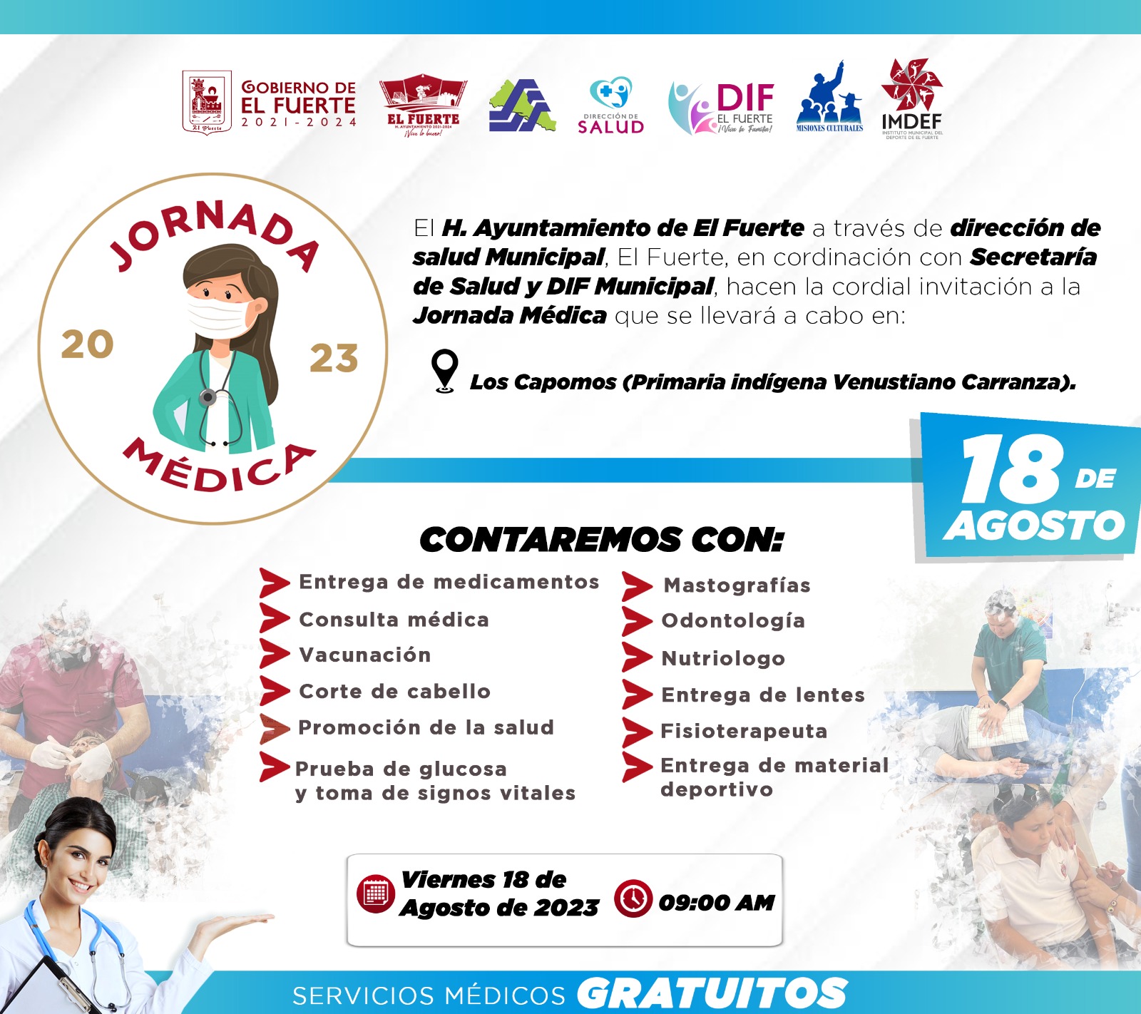 El Fuerte, Sinaloa, a 16 de agosto del 2023.- La Titular de Salud Municipal, la Dra. Grecia Marsella Acosta Ruiz, informó que ya se encuentra todo listo para llevar el programa de Jornadas Medicas a la localidad Los Capomos, con el objetivo de que sus habitantes puedan gozar de los beneficios de esta actividad. Todo esto en coordinación con DIF El Fuerte, la Secretaria de Salud y Misiones Culturales.