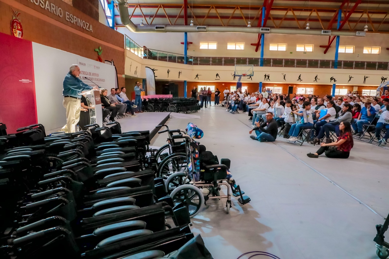 Culiacán, Sinaloa, 08 de diciembre del 2023.- El gobernador Rubén Rocha Moya acompañado por la presidenta del Sistema DIF Estatal Eneyda Rocha Ruiz, el director general de la Administración del Patrimonio de la Beneficencia Pública Adrián Benítez Ruiz y la directora general de Beneficencia Pública de Sinaloa Alma Rosa López López, hizo entrega de procesadores cocleares, auxiliares auditivos y apoyos de movilidad para personas con discapacidad.