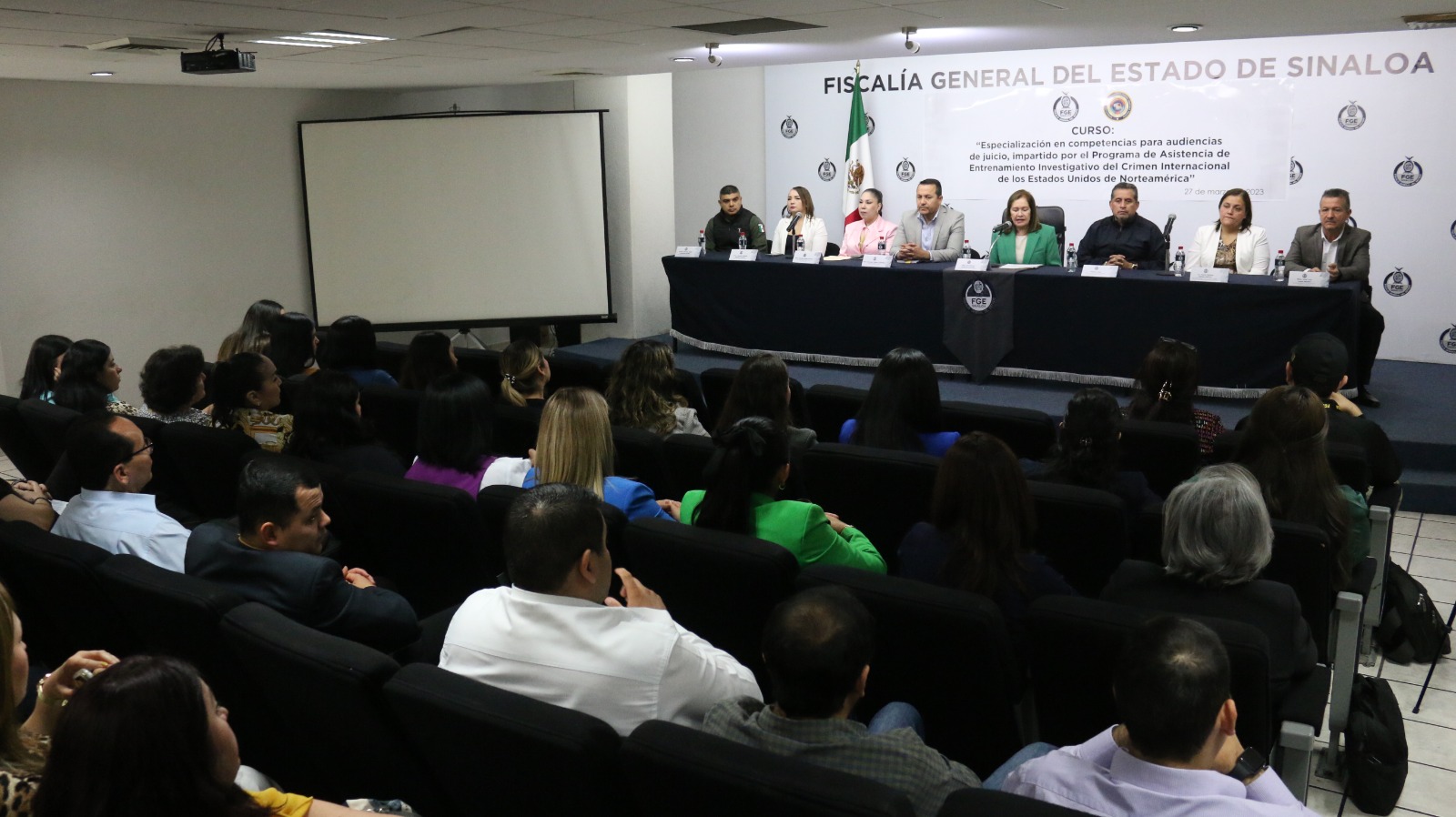 Culiacán, Sinaloa. A 27 de marzo de 2023.- Con el apoyo de ICITAP-Embajada Norteamericana en México, la Fiscalía General del Estado de Sinaloa inició este lunes el Curso-Taller de Especialización en Competencias para Audiencias de Juicio, dirigido a Peritos, Policías Investigadores, Agentes del Ministerio Público y Analistas.