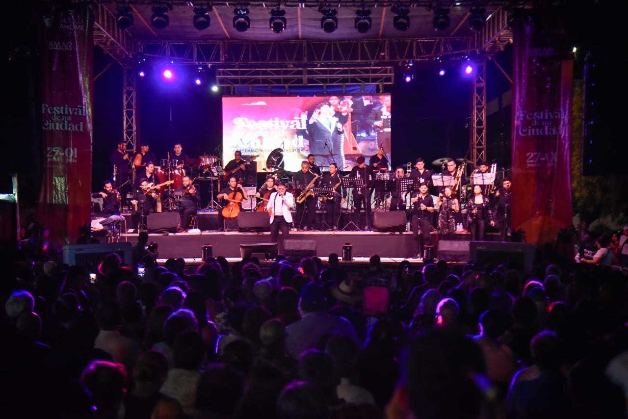 Los Mochis, Ahome, Sinaloa. 27 de Junio del 2024.- En un ambiente festivo, musical y familiar con luces de fuegos pirotécnicos, a ritmo de batucada y una fusión de la Orquesta de La Mora y la Banda Revolución para acompañar a Ariel Morales con un tributo a Juan Gabriel inició el Festival de Mi Ciudad en su 14 edición.