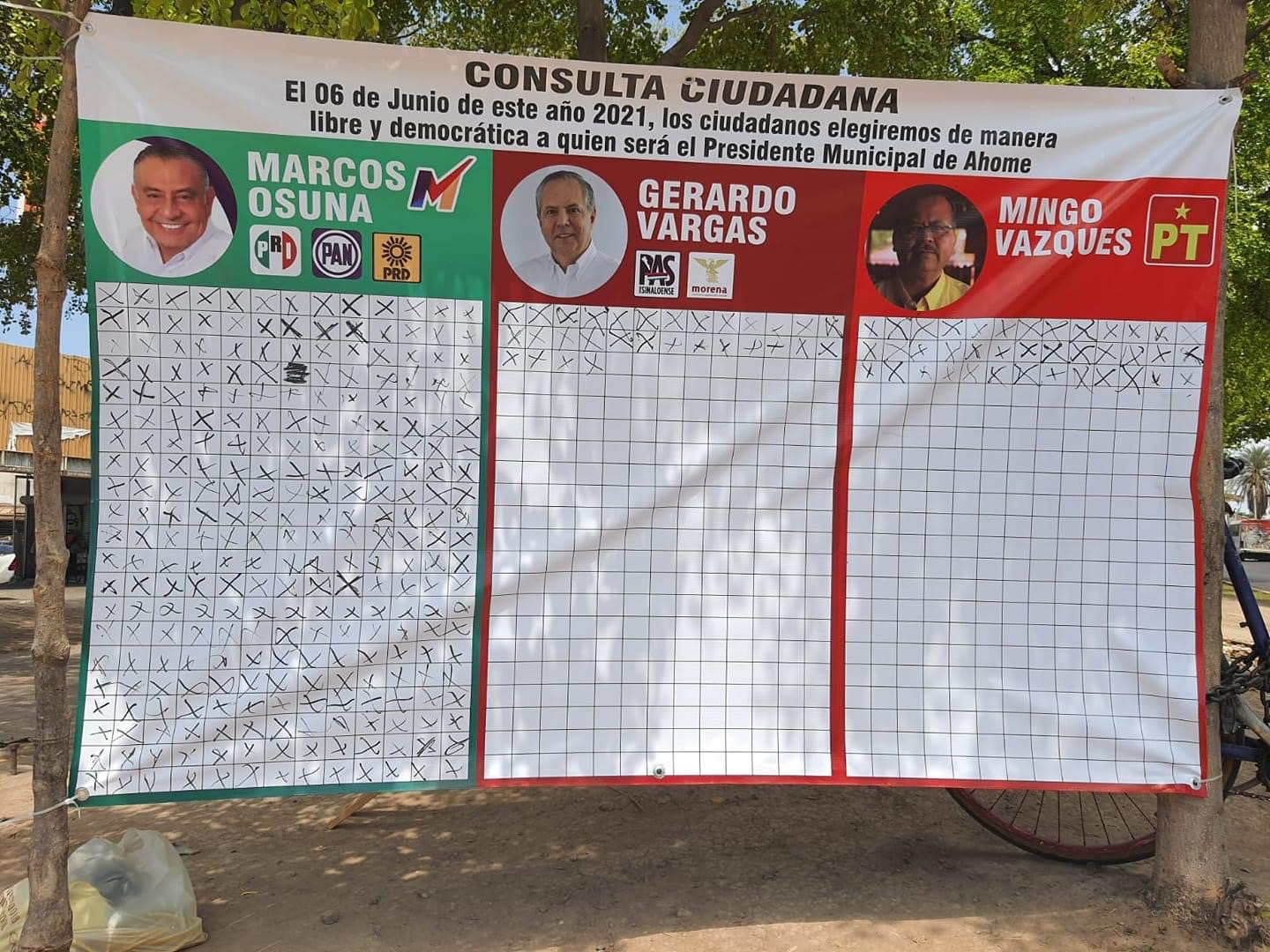 De manera libre y espontánea, los ciudadanos que transitaban a pie sobre el cruce de la Zaragoza y el bulevar Rosendo G Castro se detenían a marcar sobre su favorito para la Presidencia Municipal de Ahome.