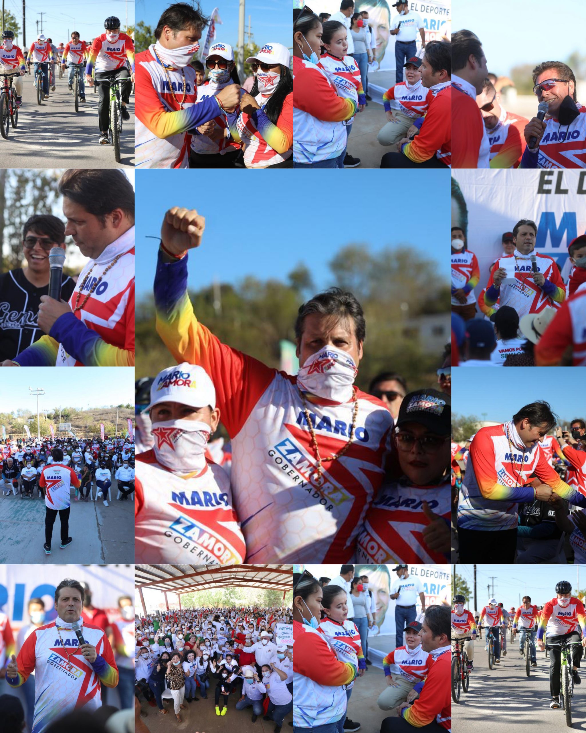 A las 17:30 horas Mario Zamora va al arco de bienvenida de Sinaloa de Leyva. Desde ahí encabeza una rodada con decenas de ciclistas para reunirse con deportistas en la unidad “Saúl Rubio”, donde lo reciben con batucada y gritos de ¡Mario!, ¡Mario!, ¡Mario!