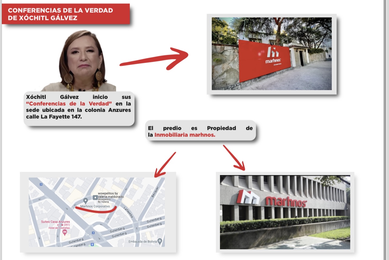 *“¿Qué estamos denunciando? Que ella [Gálvez] es socia y parte del grupo Marhnos, porque le da las licencias y contratos: conflicto de interés, tráfico de influencias, corrupción. Es la nueva modalidad del moche. Ya no es la lana literal, ya es ‘te entrego contratos o te hago el favor de pagar tu viaje a España y organizarte la agenda. Y aparte te presto mi casa, te presto mi edificio, y ahí da las conferencias de prensa’. No sabemos qué otros favores y cuánto dinero esta desarrolladora inmobiliaria le está entregando a la campaña de Xóchitl Gálvez para financiar los Xochibots. El dueño, Nicolás Mariscal, acompañó a la candidata en su reciente visita a España; gira que financió y cuya agenda organizó”,* acusó.