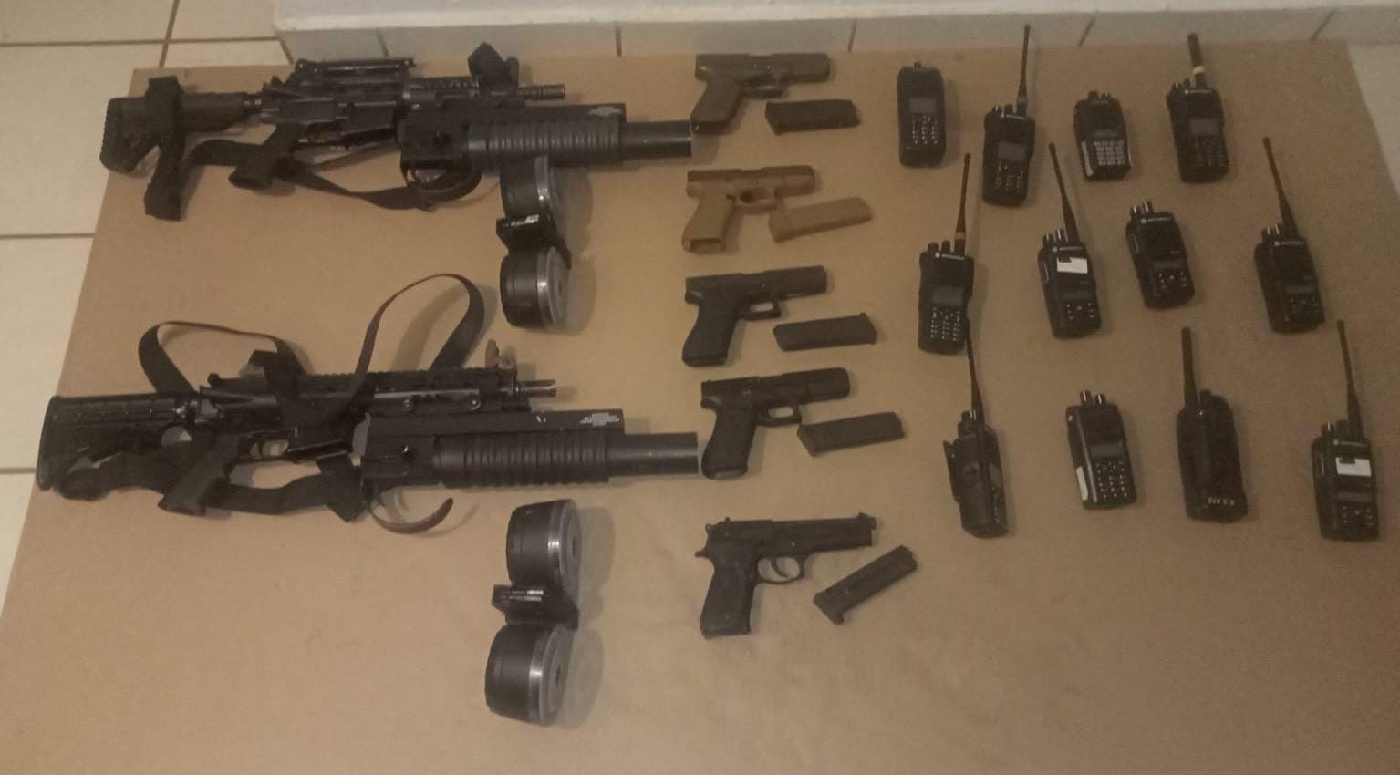 Entre lo asegurado se contabilizaron dos armas largas y cinco armas cortas, 12 radios de comunicación, un vehículo Renault de color blanco, un automóvil Nissan línea Versa blanco y una camioneta Ram, esta última contaba con blindaje, todo fue puesto a disposición de autoridad correspondiente la cual será la encargada de dar curso a lo que marca la ley.
