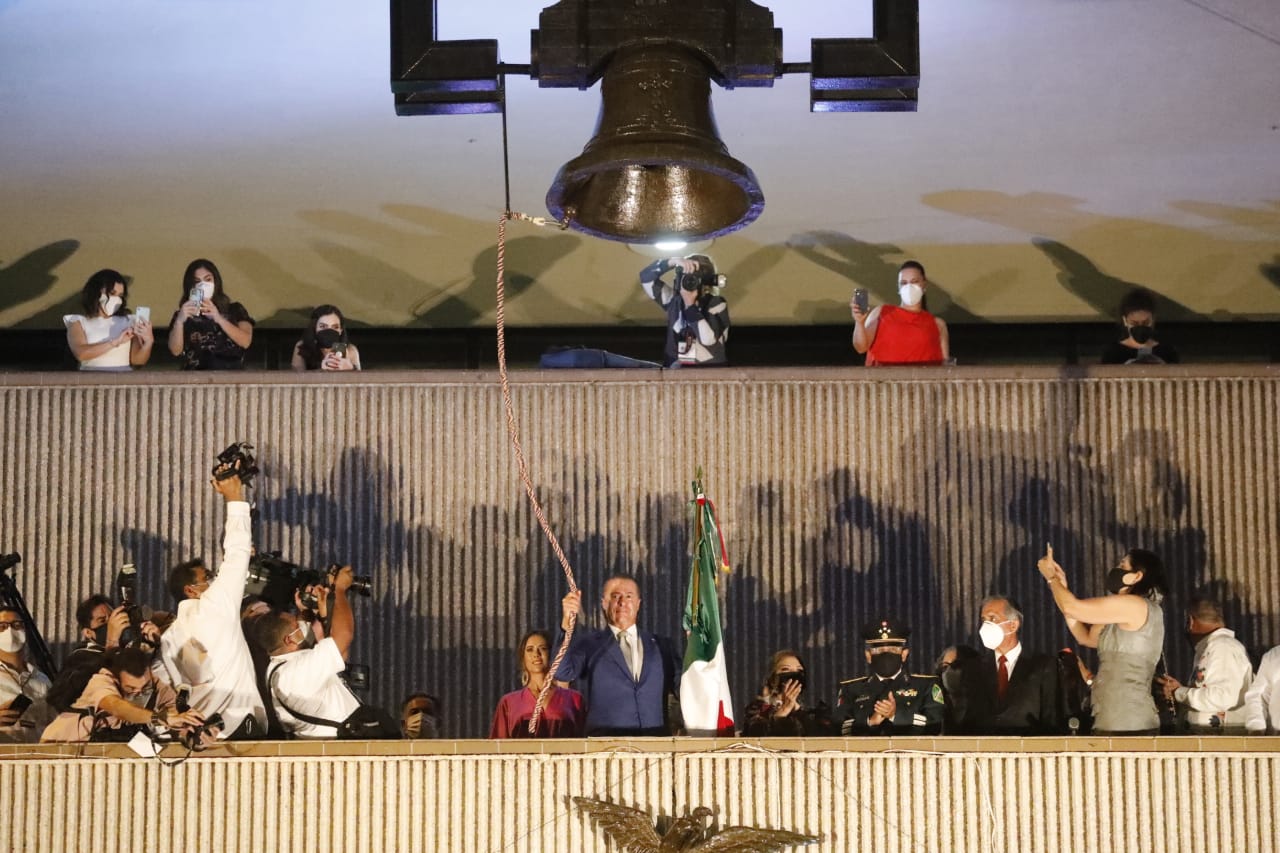 En una ceremonia inusual, respetando el protocolo de prevención ante el COVID, el mandatario estatal dio el tradicional grito desde el balcón de Palacio de Gobierno._