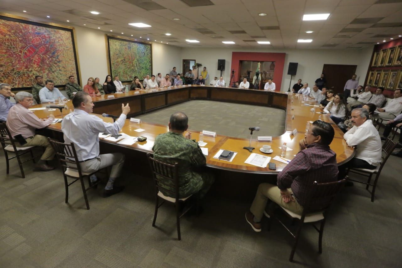 El mandatario estatal estuvo acompañado por el vocero estatal ante la contingencia, el secretario de Salud, Efrén Encinas Torres, y por varios de sus secretarios de gabinete, en una reunión en la cual también estuvo presente el comandante de la Novena Zona Militar, General de Brigada, Maximiliano Cruz Ramos, quien anunció a su vez la implementación del Plan DN III-E, de auxilio a la población civil.
