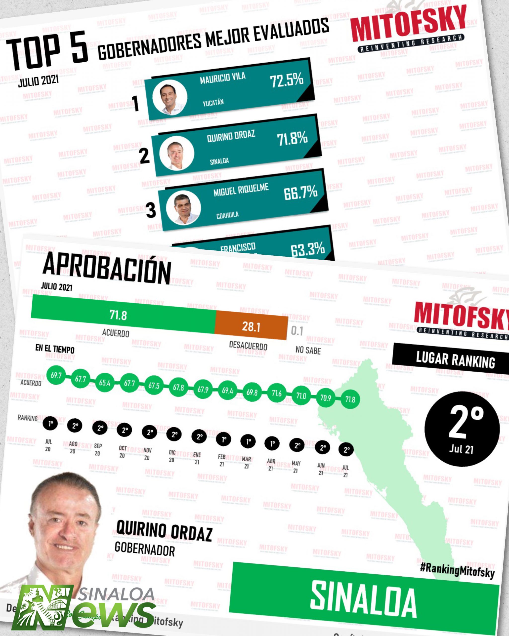 En esta medición, en las primeras cuatro posiciones mantienen Mauricio Vila de Yucatán, Quirino Ordaz de Sinaloa, Miguel Riquelme de Coahuila y Francisco Domínguez de Querétaro, mientras que Jaime Bonilla de Baja California, se coloca en la quinta posición desplazando al sexto lugar a Carlos Mendoza Davis de Baja California sur. En el puesto número siete se coloca Diego Sinuhe Rodríguez de Guanajuato y en la octava, Claudia Sheinbaum, Jefa de Gobierno de la CDMX.