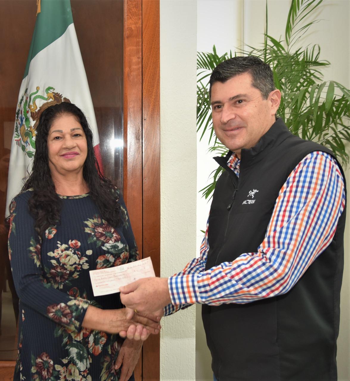 Los Mochis, Ahome, Sinaloa, 03 de Enero del 2020.- Después de casi nueve años de gestiones administrativas infructuosas para tener apoyo de gobierno por la desaparición de su esposo policía municipal, la señora Marina Aurelia López Manzanares, recibió el cheque de apoyo por el seguro de vida, de manos del alcalde Billy Chapman, quien le ayudó en la gestión y la recibió en su oficina de Palacio Municipal para hacerle la entrega.