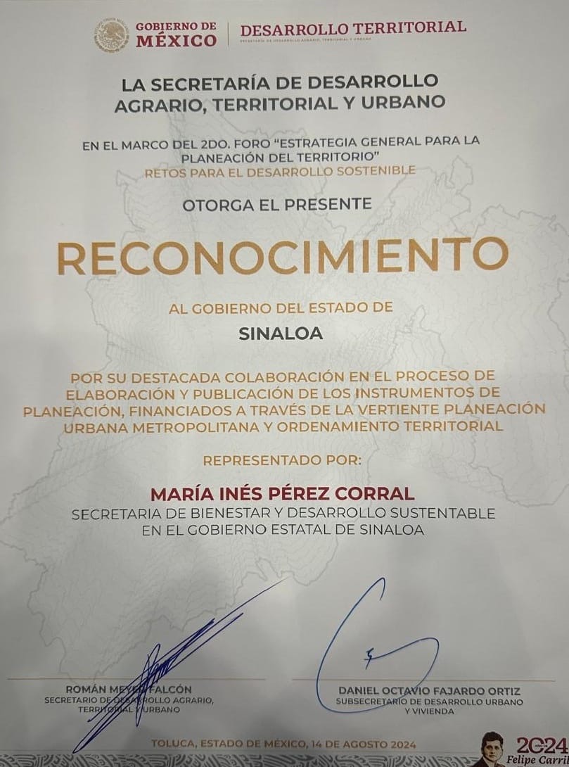 Este reconocimiento, que hoy recibe el Gobierno de Sinaloa, es derivado de la preocupación del gobernador Rubén Rocha Moya en atender la problemática del rezago histórico que tenía el estado de Sinaloa y sus municipios en instrumentos de planeación y ordenamiento territorial, ya que el 66 por ciento de los municipios de la entidad tenían instrumentos con más de 40 años sin actualizarse.
