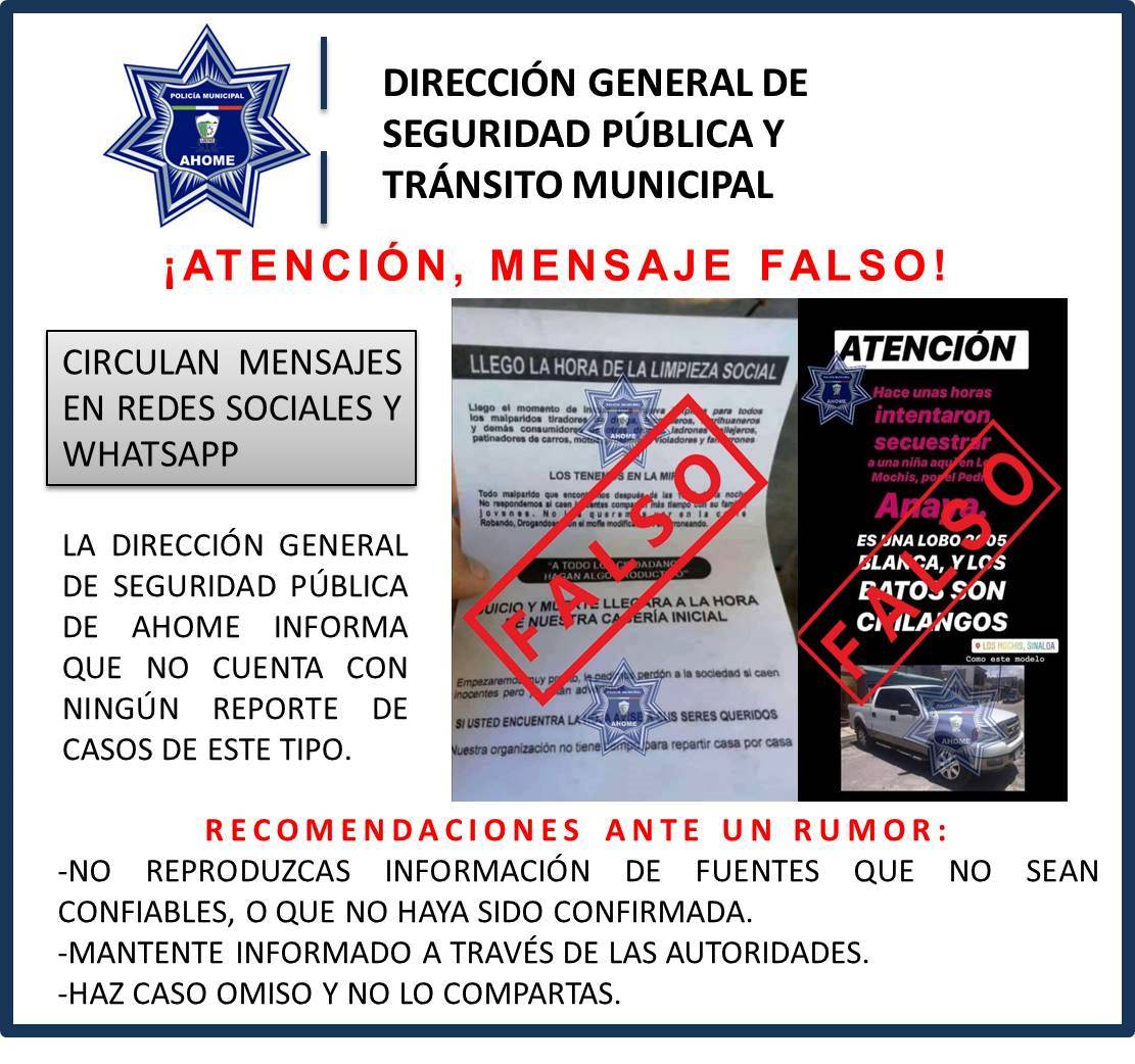 El Director de Seguridad Pública y Tránsito de Ahome, Carlos Francisco Rodríguez Ponce, dijo que “el llamado es a que eviten compartir en redes sociales supuestos hechos, los cuales carecen de veracidad y de fuente oficial, porque confunden a la población, y recientemente causan temor y desconcierto”.