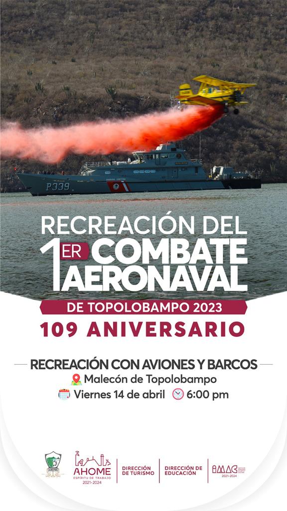 Los Mochis, Ahome, Sinaloa a 4 de Abril del 2023.- Con un evento cultural y artístico, se llevará a cabo la representación del primer Combate Aeronaval del Mundo, el cual se registró el 14 de abril de 1914 en el Puerto Heroico de Topolobampo.