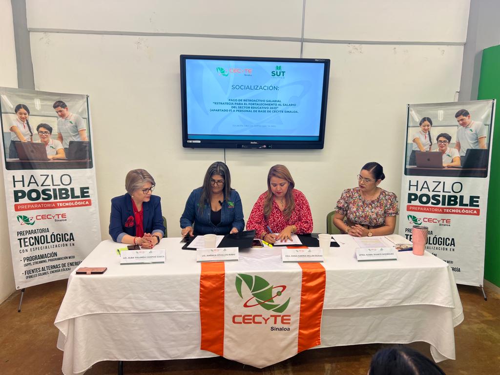 La Dra. Emma Karina Millán Bueno, Directora General de CECyTE Sinaloa y la Lcda. América Cevallos Rubio, Secretaría General del SUTCECyTE, firmaron el documento para informar el pago del retroactivo salarial «Estratégica para el Fortalecimiento al Salario del Sector Educativo 2023 (Apartado F) a personal de base de CECyTE Sinaloa, prestación otorgada por el Gobierno Federal y Estatal, para atender a la base trabajadora sindicalizada, con categoría administrativa y docentes definitivos, en sus respectivas plazas con nombramiento definitivo.