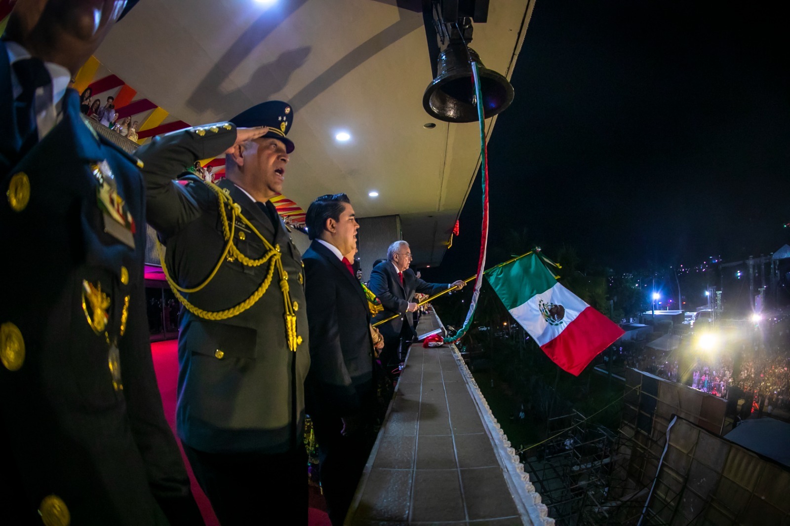 “Mexicanas y mexicanos, sinaloenses; Vivan los héroes que nos dieron patria, Viva Hidalgo, Viva Morelos, Viva doña Josefa Ortiz de Domínguez, Viva Aldama, Viva Guerrero, Viva la Independencia Nacional, Viva el presidente Andrés Manuel López Obrador, Viva México, Viva México, Viva México, Viva Sinaloa”, dijo a todo pulmón el mandatario estatal, para enseguida con bandera en mano repicar la campana del balcón principal, ante la algarabía de la multitud que coreó todos y cada uno los “Vivas”.