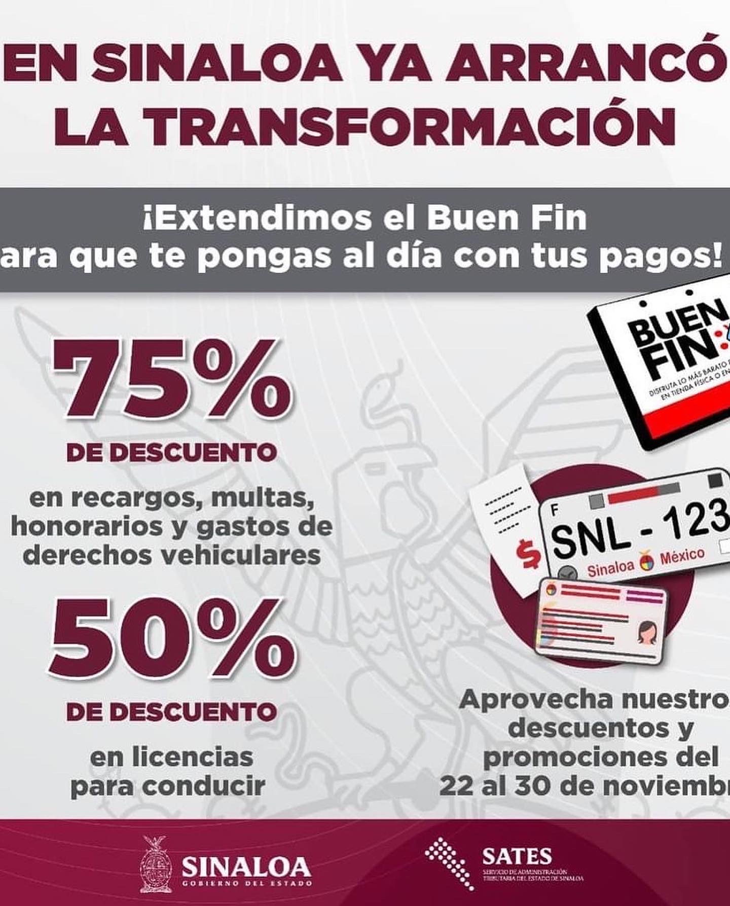 Del 22 al 30 de noviembre de este año, la ciudadanía puede realizar sus pagos con descuentos que van desde el 75% en recargos, multas, honorarios y gastos en derechos vehiculares (Tarjeta de Circulación y Calcomanía), canje y alta de placas, además de un 50% de descuento en licencias de conducir.